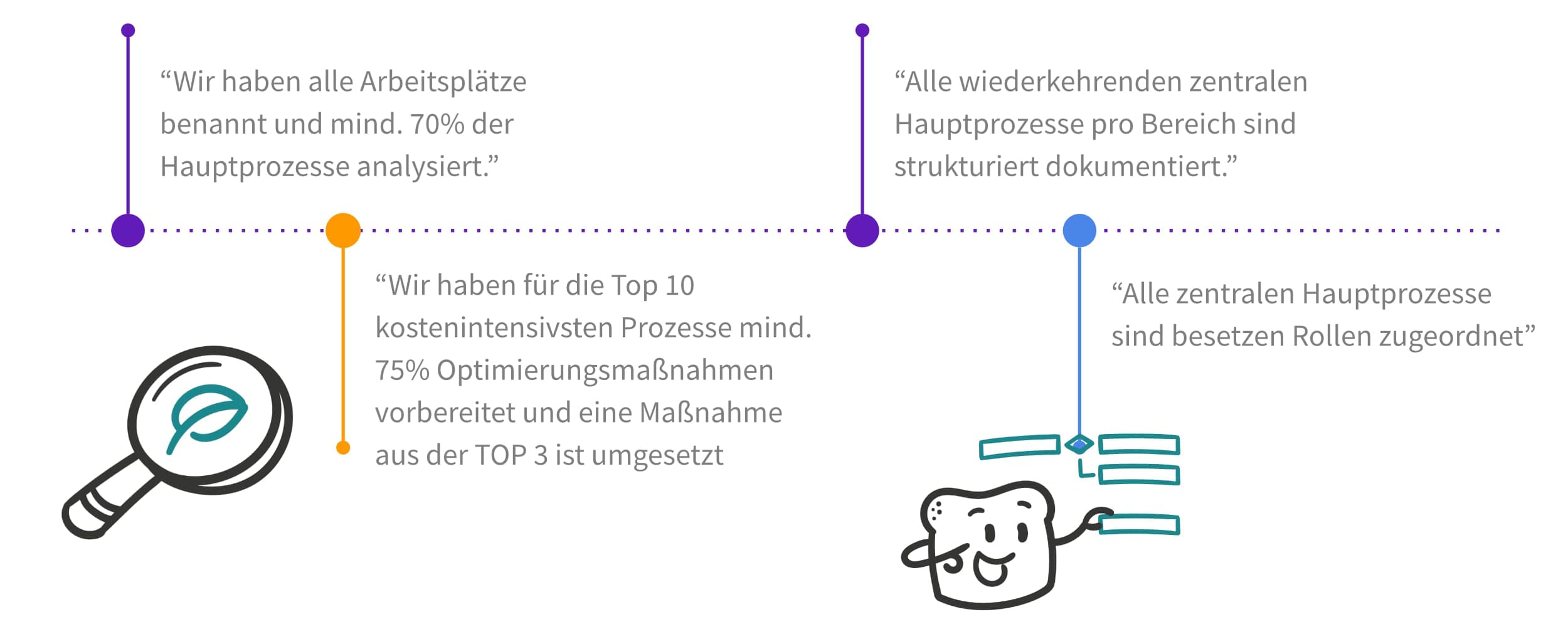 Indem wir diese Kernprozesse analysieren, schauen wir uns genau an, wie wir Dinge tun, um zu sehen, ob es Möglichkeiten gibt, sie effizienter oder effektiver zu gestalten. Das kann bedeuten, dass wir unnötige Schritte eliminieren, Abläufe vereinfachen oder neue Technologien einführen, um unsere Arbeit schneller oder besser zu erledigen.